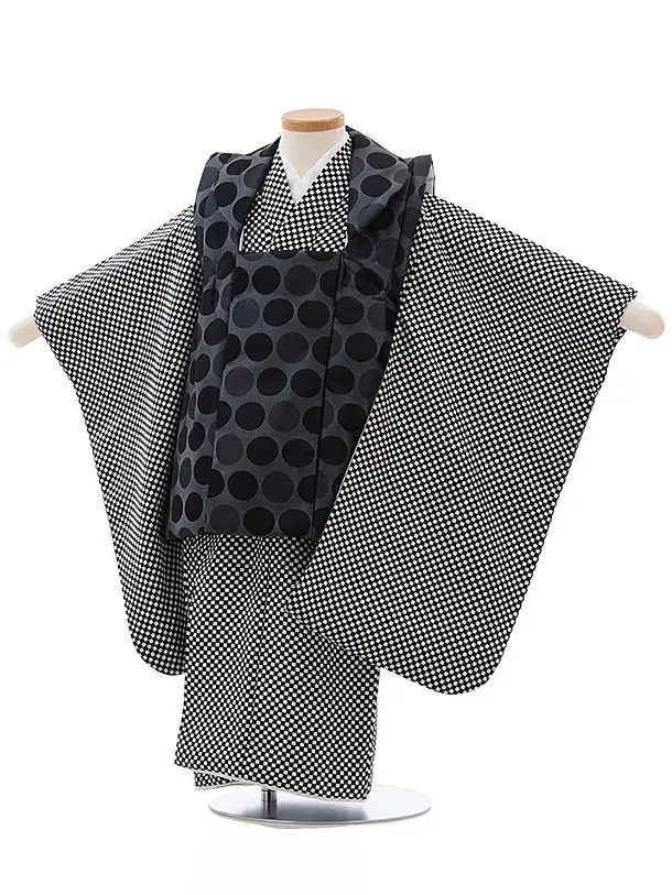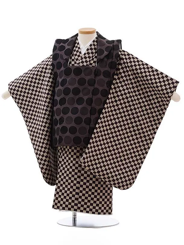 七五三レンタル(3歳男児被布)2365 ラメグレー地 ドット×黒白市松