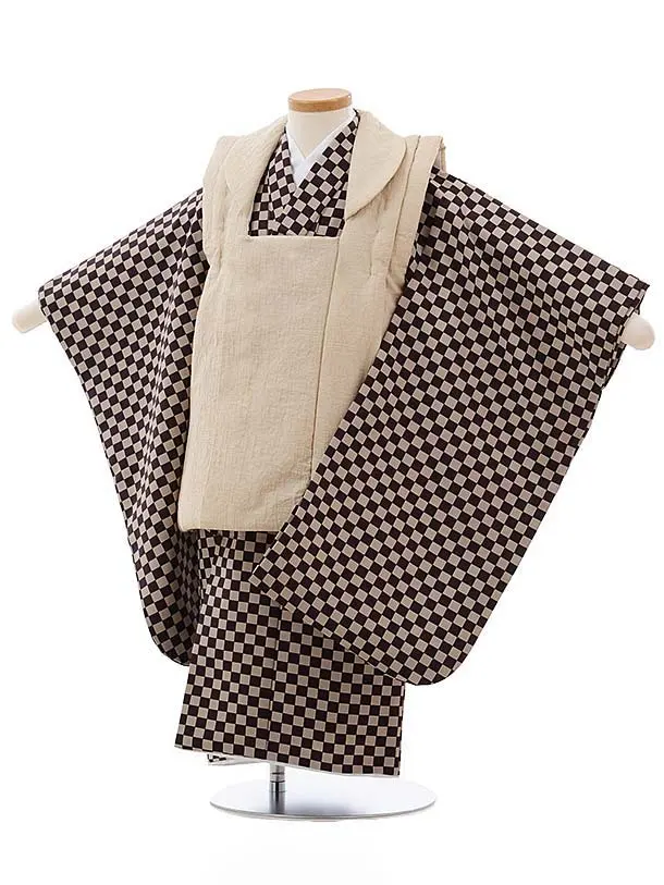 七五三レンタル(3歳男児被布)2371 ベージュ×ブラウン市松