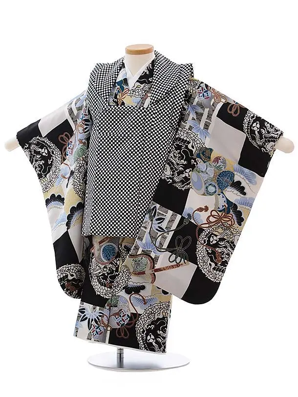 七五三レンタル(3歳男児被布)2374 黒白市松×黒白地 龍