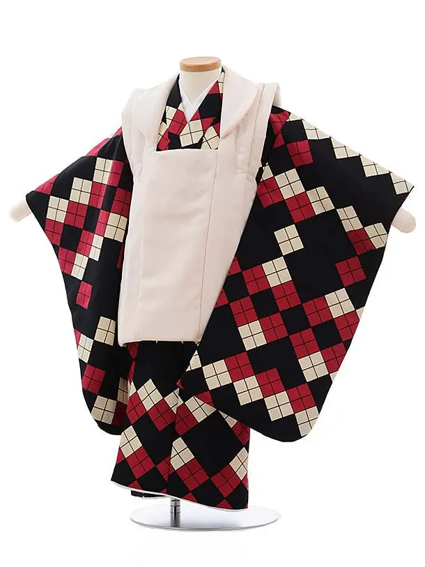七五三レンタル(3歳男児被布)2376 ラメアイボリー×黒赤アーガイル
