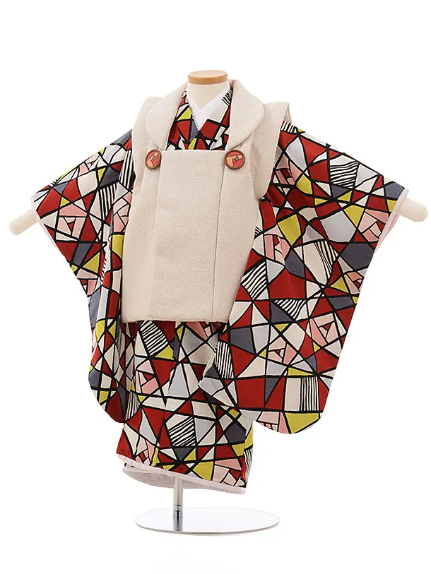 七五三(3歳男児被布)2392 ラフィネココ グレージュx 白赤モダン柄