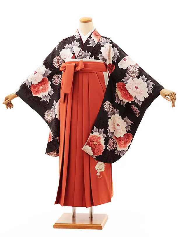 卒業式袴レンタルV700 黒地牡丹×テラコッタ