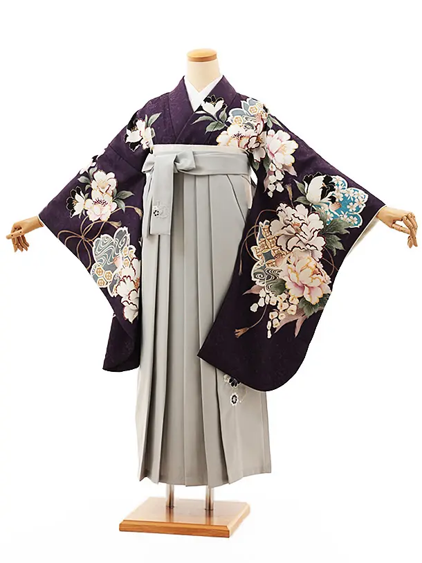 卒業式袴レンタルV725 パープル地牡丹×グレー