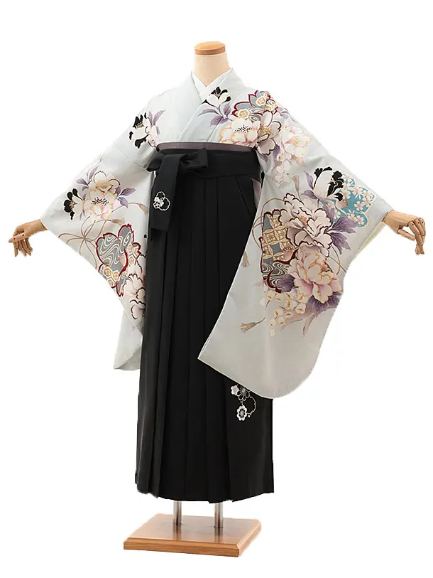 卒業式袴レンタルV731 ペールブルー地牡丹×黒