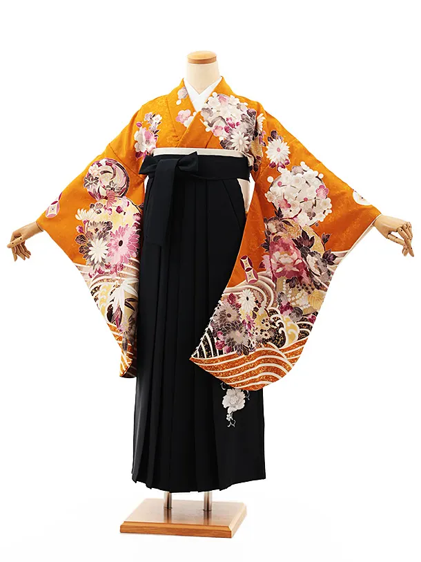 卒業式袴レンタルV738 マスタード地 波花づくし×濃紺