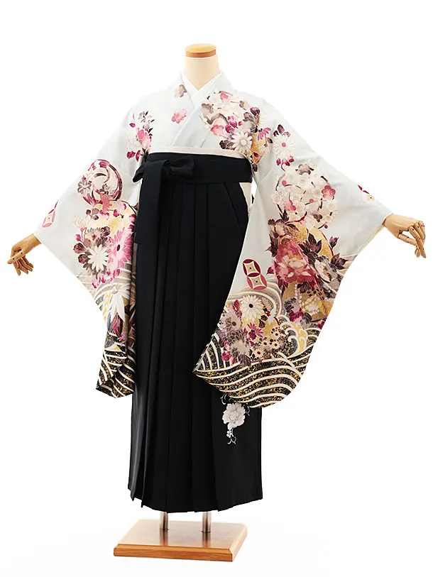 卒業式袴レンタルV747 白地 波花づくし×グレー