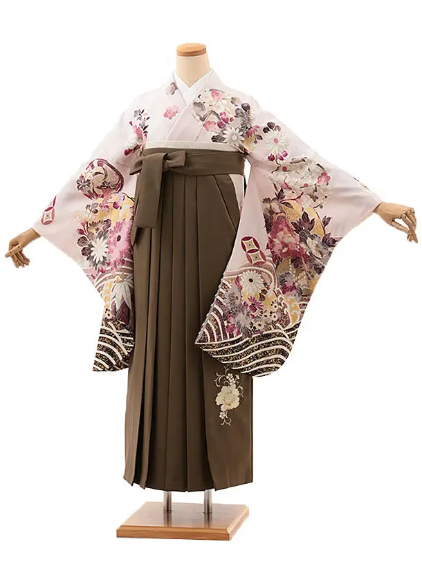 卒業式袴レンタルV729 クリーム地牡丹×モカブラウン