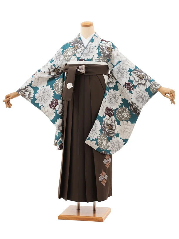 卒業袴T231 Kansai スモーキーターコイズ 花×カーキグレー