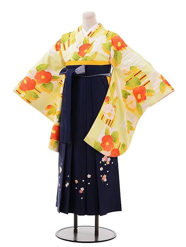 卒業式袴レンタル h209 黄緑 椿×紺袴