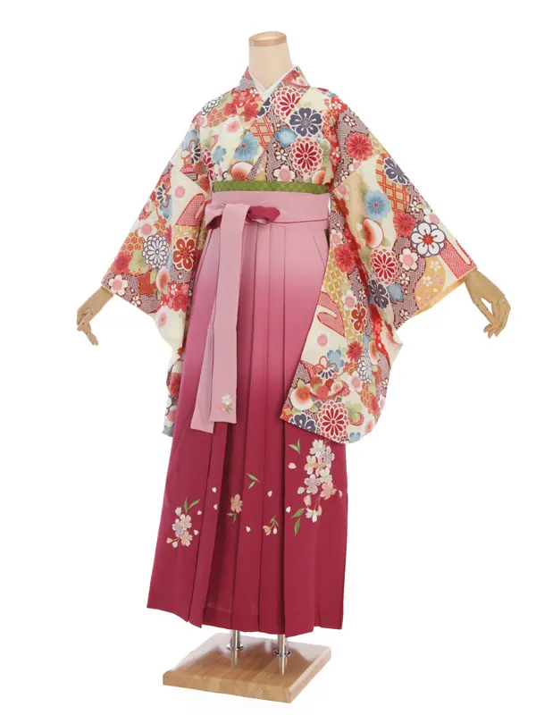 卒業式袴レンタル h247 九重 クリーム地 赤黒 松×からし色袴