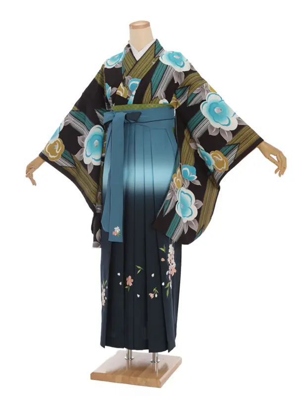 卒業袴レンタルh262 黒地 水色 つばき x ぼかし袴