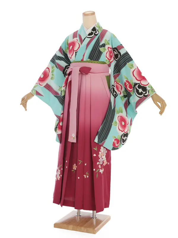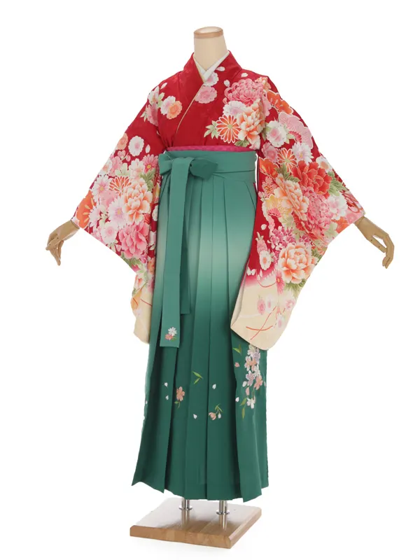 卒業袴レンタルh271 赤地 ぼたん x グリーンぼかし袴