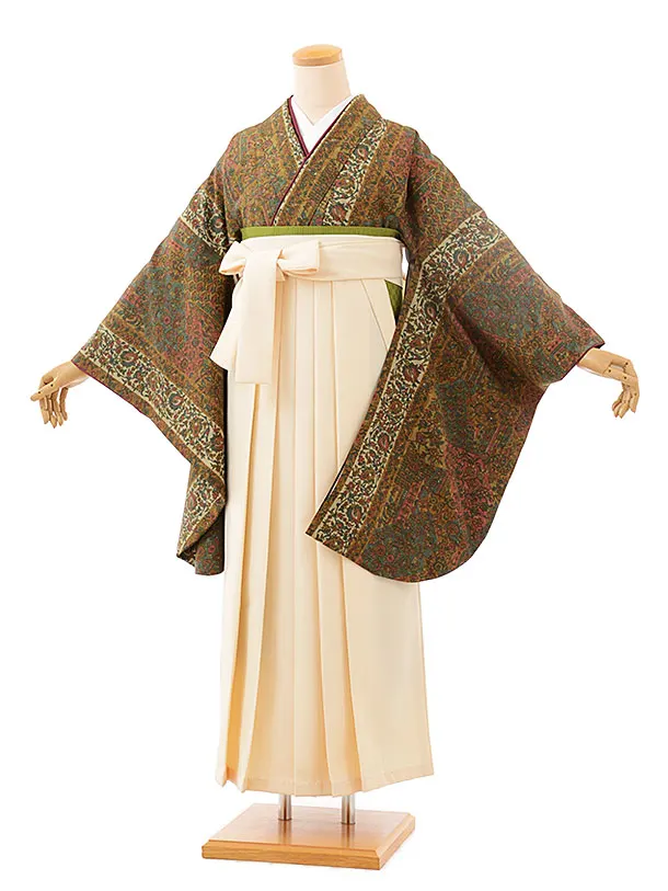 卒業袴レンタルh680 クリーム色地 なでしこ x グリーン袴