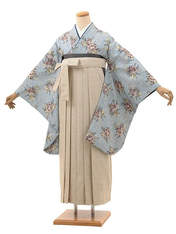 卒業式袴レンタルV006 ブルーグレーダマスク柄花×アイボリー