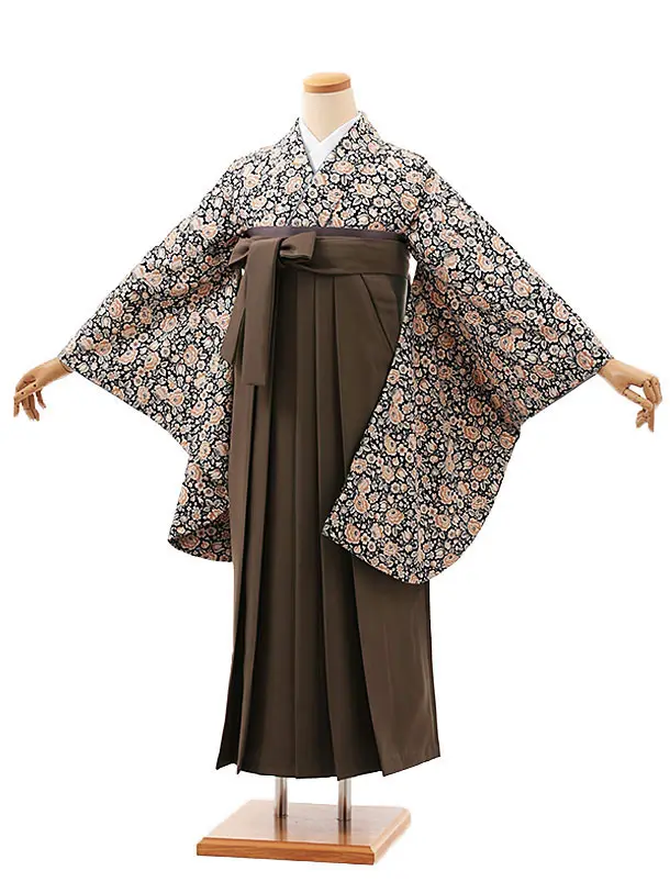 卒業式袴レンタルV578 黒地小花×ブラウン