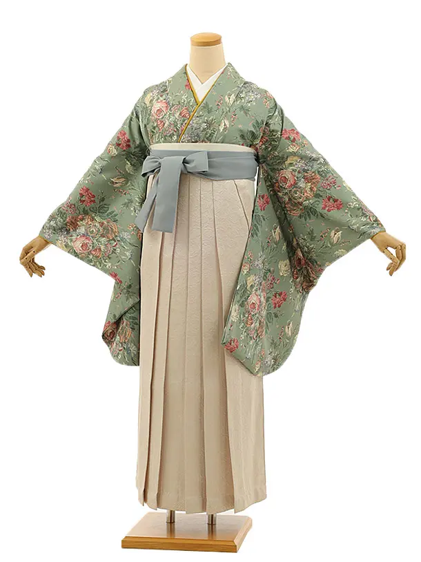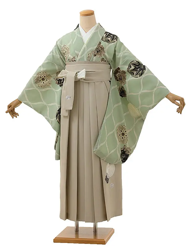 卒業袴T158 紅一点 ペールグリーン菊牡丹×モスグリーン