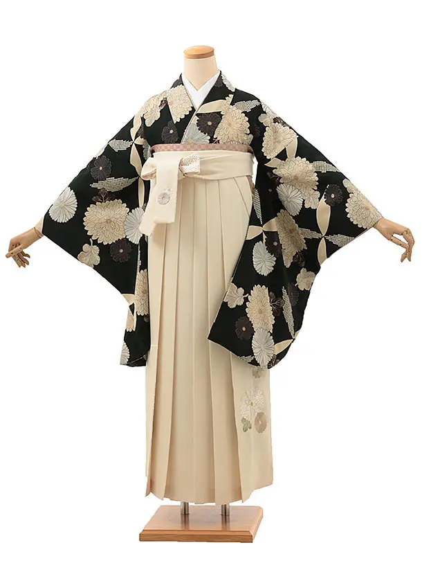 卒業式袴レンタルV016 九重 黒地菊×クリーム