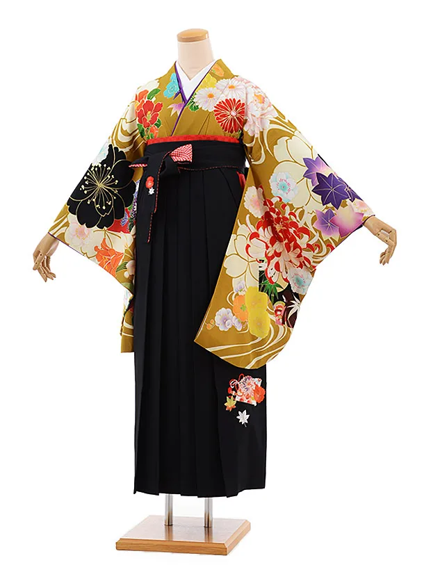 卒業袴レンタルh638 JAPAN STYLE 金茶地 大花x黒袴