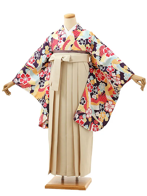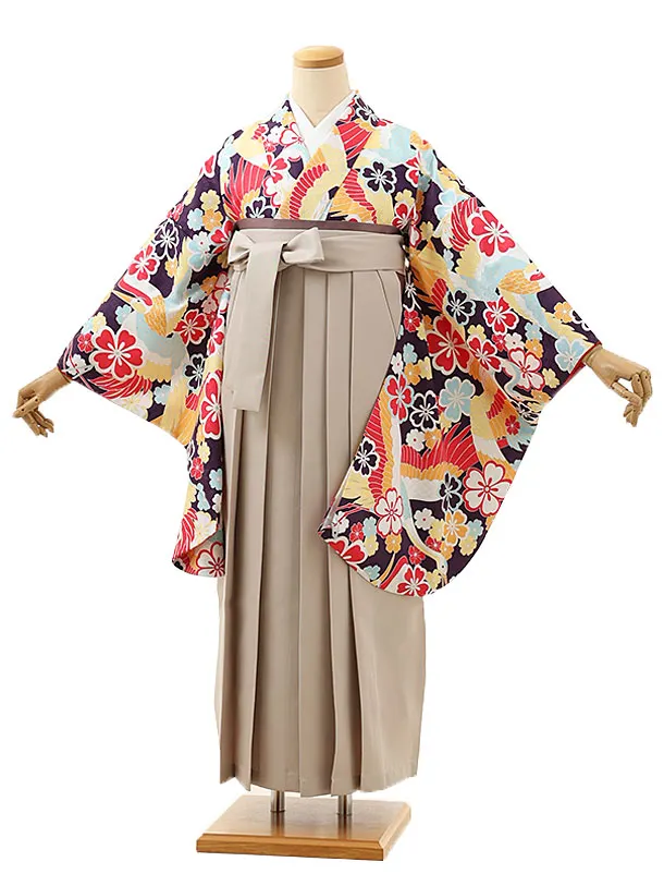 卒業式袴レンタル1607 パープル桜 鶴×グレージュ