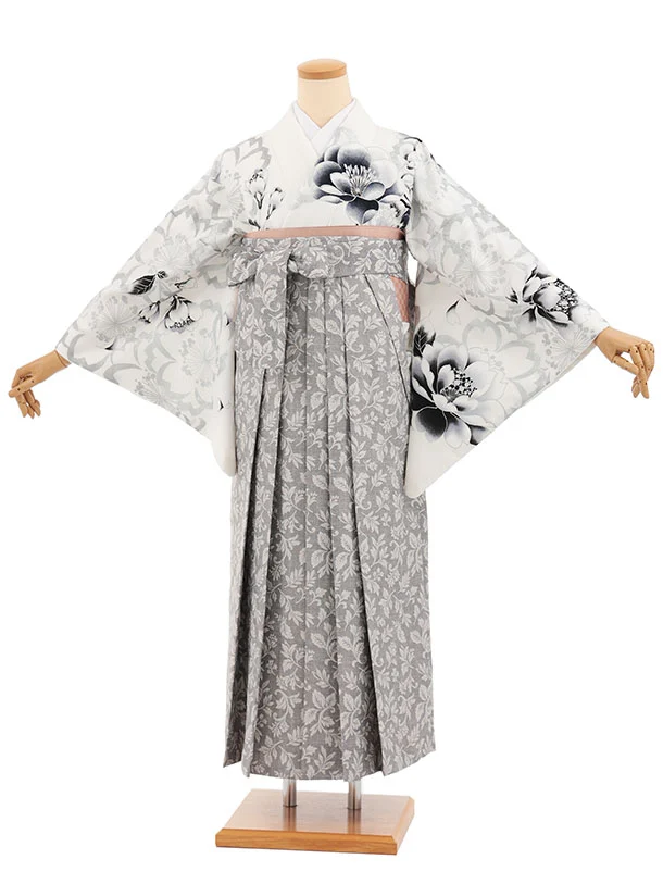 先生,教員向け袴レンタルT245 白地牡丹×グレー花