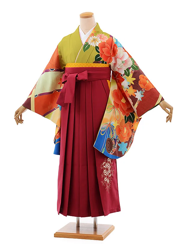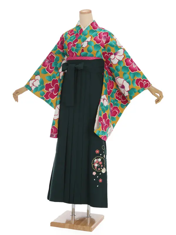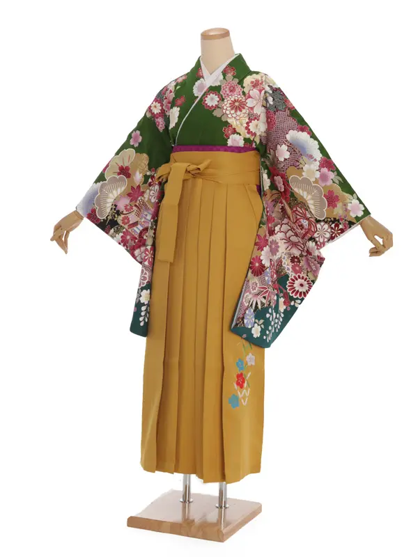 卒業袴レンタルh342 からし地 花柄 x 緑袴