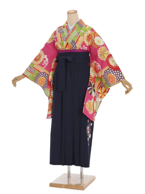 卒業袴レンタルh343 ピンク地 菊 x 紺袴