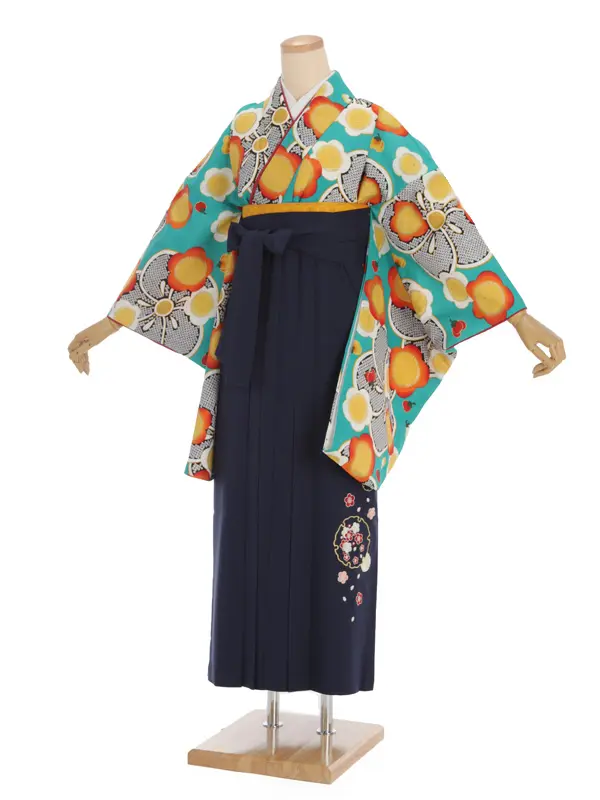卒業袴レンタルh352 エメラルドグリーン 梅 x 紺袴