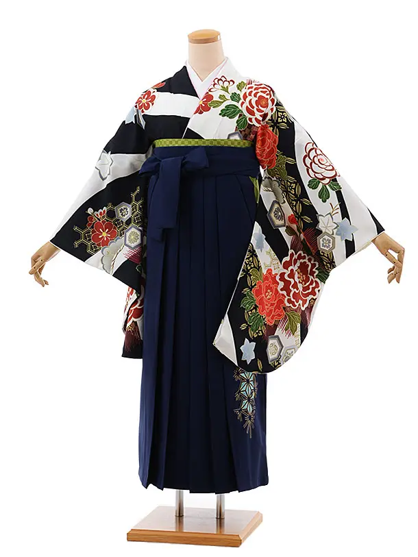 卒業式袴レンタルh371黒白ぼたんx紺袴