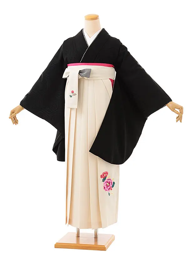 卒業袴レンタルh748 アイボリー地模様入りx黒袴