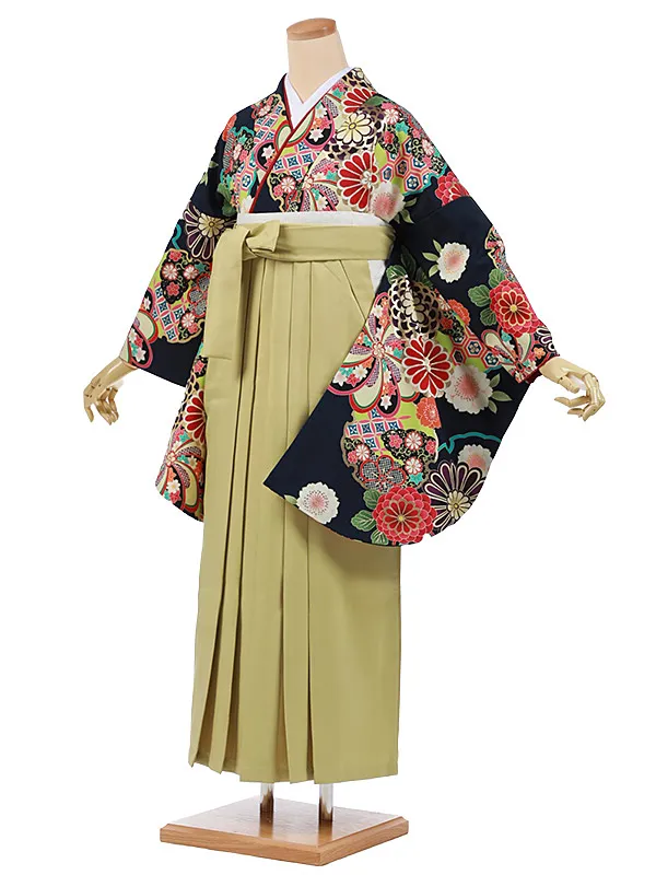 卒業袴レンタルh938 紺地 雪輪菊桜×ライムグリーン袴