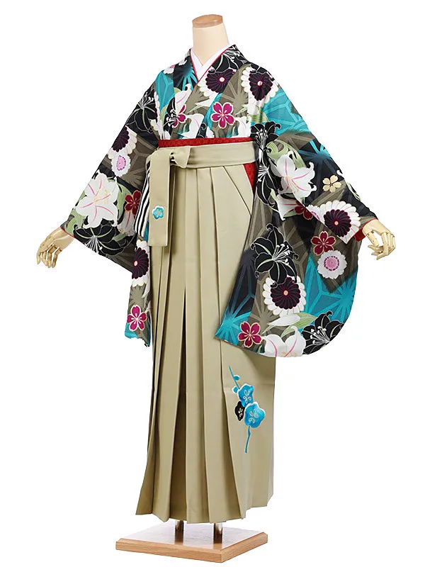 卒業袴レンタルh996 ターコイズ花×ベージュ袴