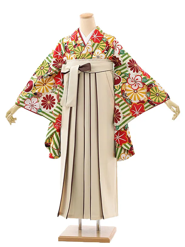 卒業袴レンタルh944 グリーンストライプ花×アイボリー袴