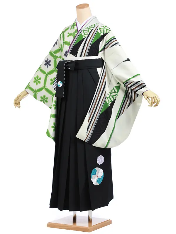 卒業袴レンタルh941 グリーンストライプ花×アイボリー袴