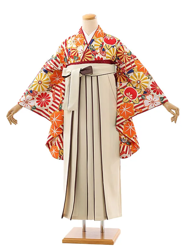 卒業袴レンタルh950 赤ストライプ花×アイボリー袴