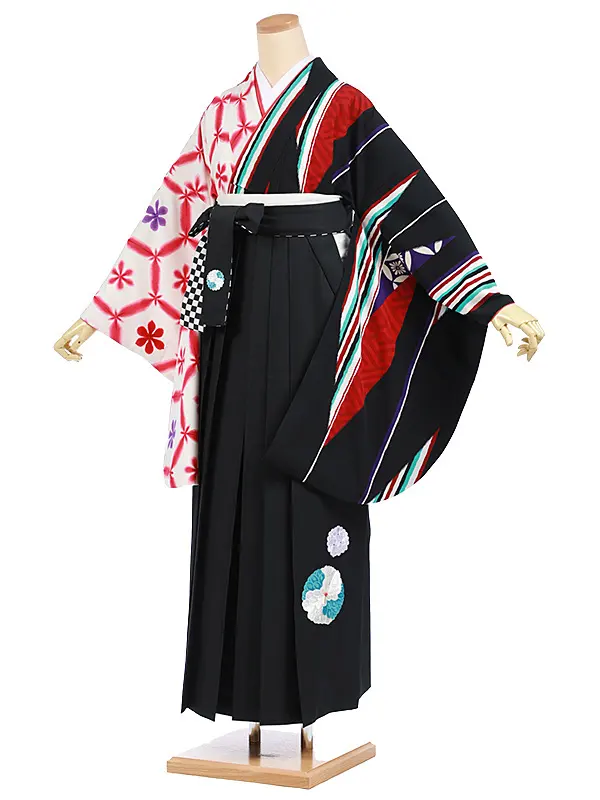 卒業袴レンタルh959 白黒アシンメトリー亀甲×黒袴