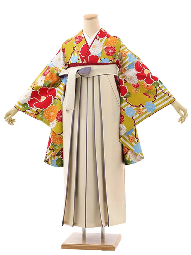 卒業袴レンタルh980 からしストライプ椿×アイボリー袴