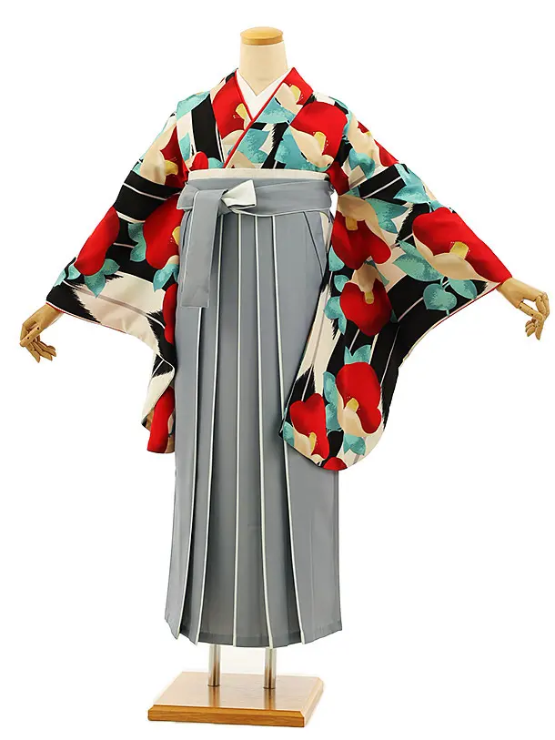 卒業袴レンタルh1024 紅一点アイボリー黒矢柄椿×グレー袴