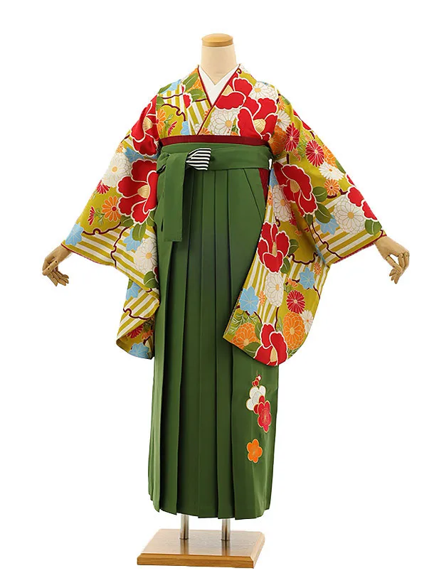 卒業袴レンタルh1112 からしストライプ椿×グリーン袴