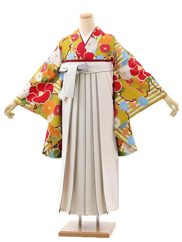 卒業袴レンタルh1122 からし色ストライプ椿×オフホワイト袴