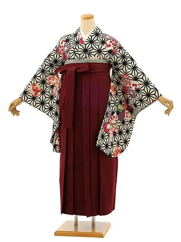 卒業袴レンタルh1157 アイボリー麻の葉桜×エンジ袴