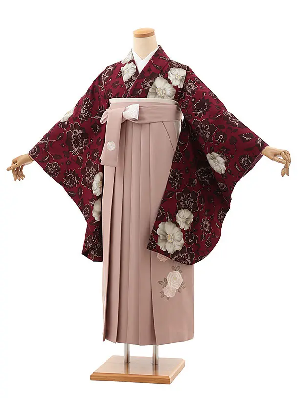 卒業式袴レンタルV616 紅一点 ボルドー華更紗×モーヴピンク