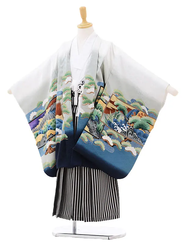七五三レンタル(5歳男の子袴)5152雲波多色柄アイボリー×灰水色袴