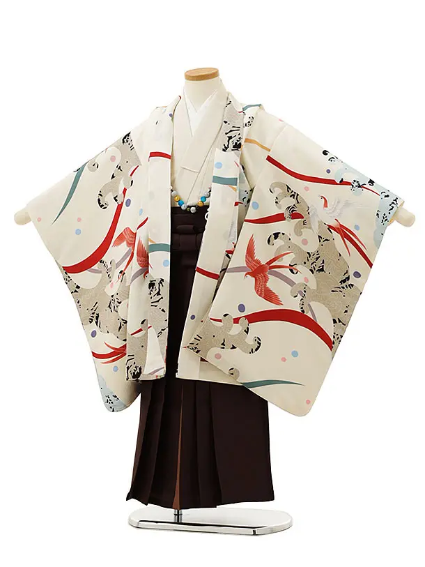 七五三レンタル(5歳男袴)X056オフホワイト波につばめx茶袴