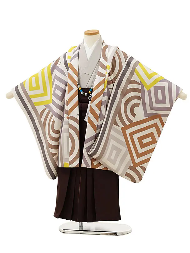 七五三レンタル(5歳男袴)X057アイボリー幾何学x茶袴