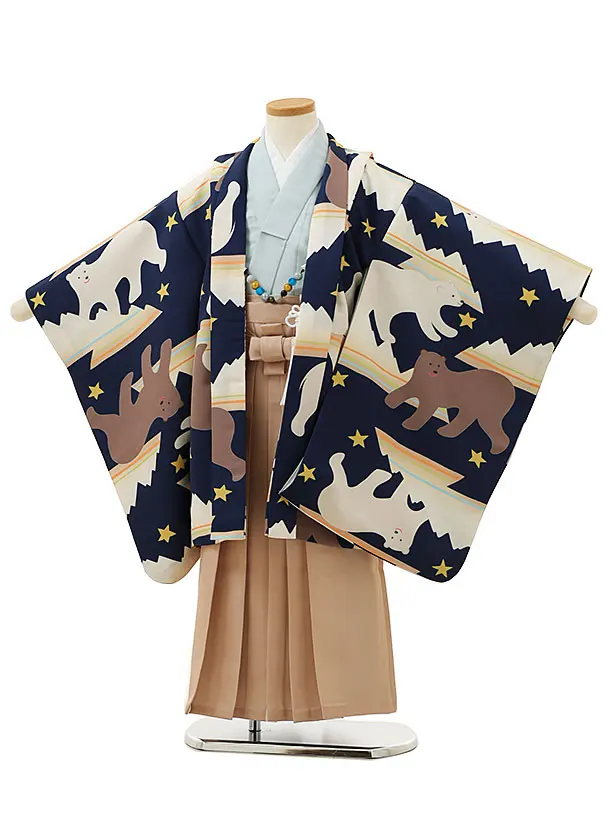 七五三レンタル(5歳男袴)X061紺地くまxベージュ袴