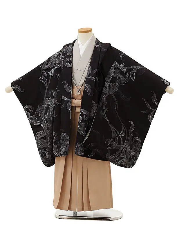 七五三レンタル(5歳男袴)X062黒地洋花xベージュ袴