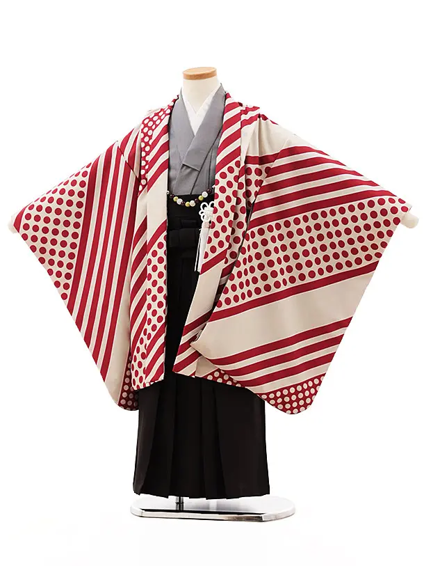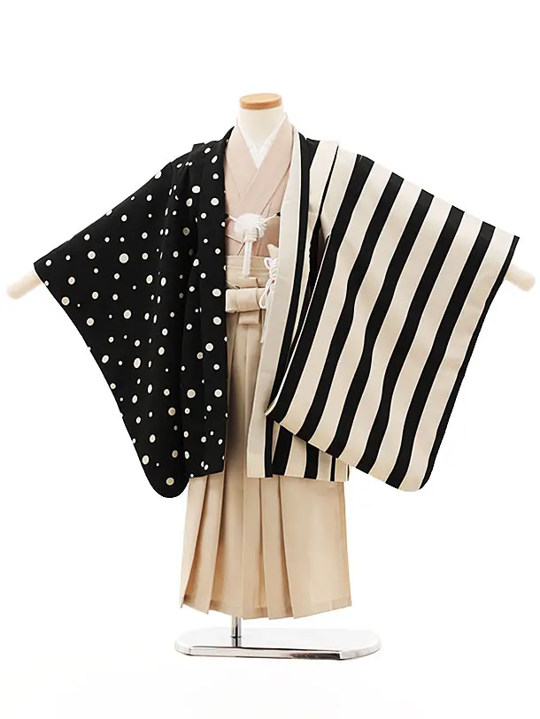 七五三(5歳男袴)X334 ベージュ赤ドットストライプ×黒