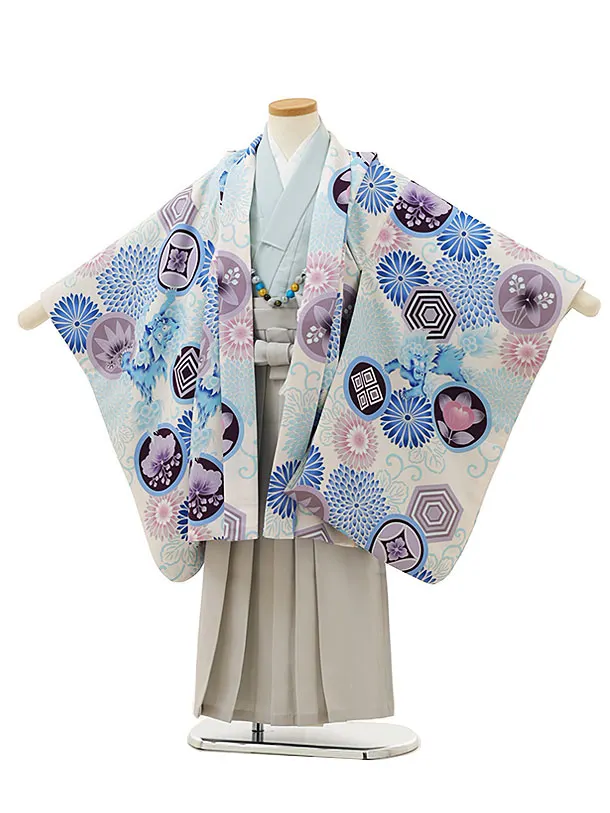 七五三レンタル(5歳男袴)X065オフホワイト菊に獅子xグレー袴