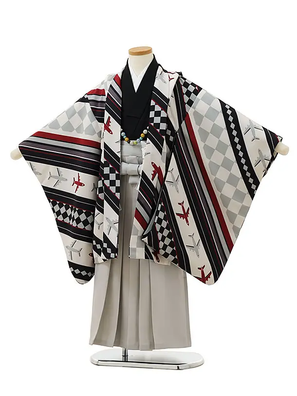 七五三レンタル(5歳男袴)X068アイボリー黒飛行機xグレー袴