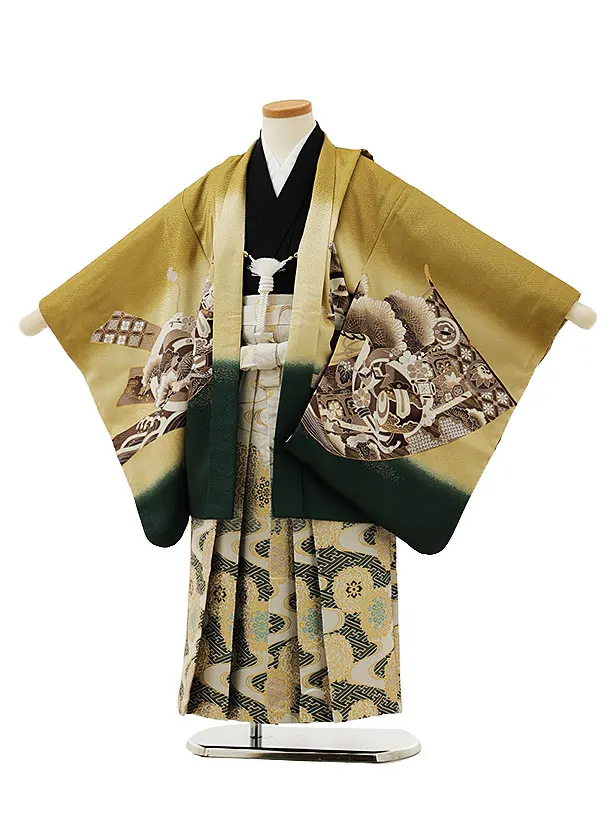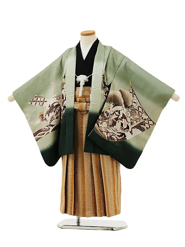 七五三レンタル(5歳男袴)X095からしグリーン几帳兜×白グリーンぼかし袴